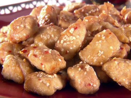 In another bowl or plastic bag, mix together the flour and sesame seeds. Drain the chicken cubes and blot any excess liquid, and then toss in the flour to coat lightly. Spread the chicken cubes on the prepared baking sheet and drizzle with the melted butter. Bake until the chicken is crispy but not dry, about 20 minutes, turning the cubes halfway through. Serve with rice.