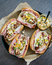 Heat a grill pan or large cast-iron skillet. Cook the bratwursts over moderately high heat until browned all over, about 5 minutes. Fill the rolls with the pastrami, cheese and brats. Top with some of the dressing and giardiniera and serve.
