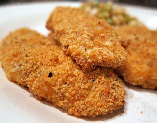 Place eggs and cracker crumbs in two separate shallow bowls. Mix cracker crumbs with garlic salt and pepper. Dip chicken in the eggs, then dredge in the crumb mixture to coat.