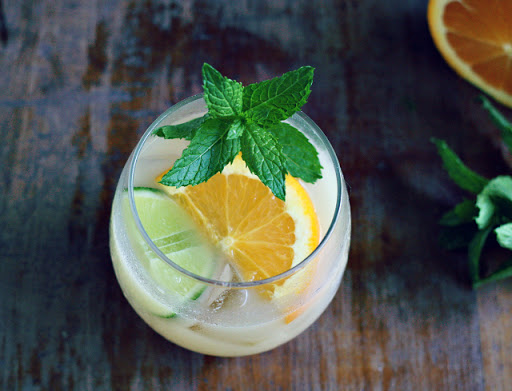 In a cocktail shaker, add rum and orange. Muddle together for 30-40 seconds. Add remaining ingredients. Shake vigorously without ice for 40-50 seconds. Strain into cocktail glass over ice. Garnish with orange slices. Serve immediately.