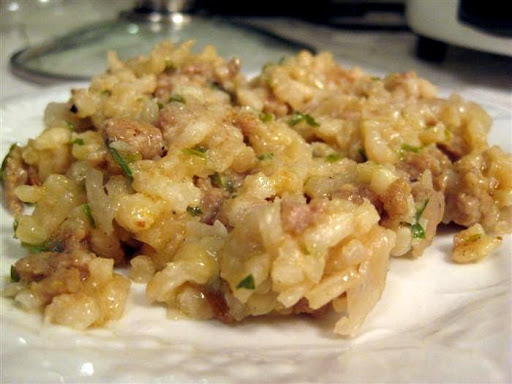 In a heavy (I prefer cast iron) skillet, melt 2 tablespoons of the butter over medium-high heat. Add the sausage and onion, breaking up any large pieces. Saute until the onions are translucent (4-5 minutes). Add rice and wine, then bring to a boil until all the liquid evaporates. Add the broth, bring to a boil, and then reduce heat to a simmer until risotto is tender (15 minutes). Mix in the Parmesan cheese and top with parsley. Season with salt and pepper to taste.