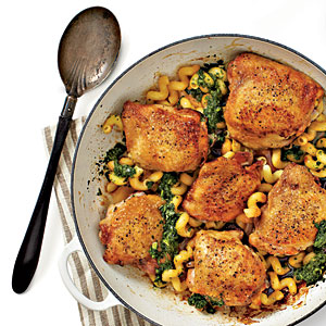 Potatoes & Rosemary: Omit pasta, chicken broth, and pesto. Prepare recipe as directed through Step 3. Place 2 lb. small fingerling potatoes, cut into 1/2-inch-thick pieces, in a single layer in skillet, and sprinkle with 1 Tbsp. chopped fresh rosemary and 1/4 tsp. salt. Place chicken, skin sides up, in skillet, and sprinkle with 1/4 tsp. chopped fresh rosemary. Bake as directed.