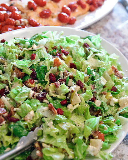 *On a large platter, combine the lettuce, pears, cranberries, pecans, bacon and feta cheese. Drizzle generously with poppy seed dressing, followed by some of the balsamic vinaigrette. (I would estimate that I used about a cup of dressing: 70 percent poppy seed dressing and 30 percent balsamic vinaigrette) If you prefer your salad to have more dressing, feel free to experiment with the combination.