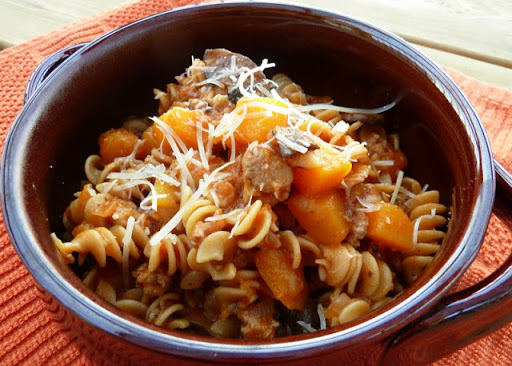 In a large skillet, heat the olive oil over medium heat and add the onion; sauté for a few minutes until softened. Add the sausage and break up with a wooden spoon or spatula, Cook until done. Add the mushrooms and sauté for a few minutes. Add the cubed butternut squash and season with salt and pepper. Add the water and cook thoroughly for about 7 minutes. Add the pasta sauce and herb mix and bring to a simmer.