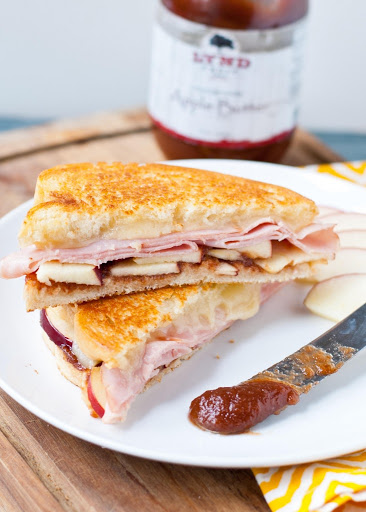 Brush one side of each of the bread slices with the melted butter. Flip slices over so the buttered side is facing down. Stack four of the slices with cheese, ham, and sliced apples. Spread the apple butter evenly over the remaining four slices.