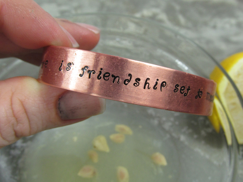 Using Lemon Juice and Salt, you can literally sit back and watch the copper clean itself in front of you. I’ve only used a small amount in the pictures below, so that I could show you a before & after on the same cuff. You can and should use enough lemon juice to cover the surface of the cuff, and about a tablespoon of salt. It’s not an exact science, I even left the seeds in!