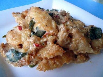 3) Remove oil from the pan and leave about 1 tbsp and stir fry the curry leaves and chili until fragrant. Add in the milk and bring it up to boil. Add in salt, pepper and sugar and reduce the milk to half and sauce thicken.