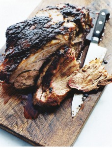 Preheat the oven to 150 deg C. When it’s time to cook the pork, place it in a roasting pan with about 1cm of water. Roast the pork for several hours till it’s very tender (about 3 hours for a 2kg shoulder), turning every hour or so and adding more water when necessary. Finish roasting with the skin side up. Raise the heat towards end of cooking, if necessary, to make the skin a bit crispier.