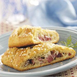 Spread half of corned beef filling down center of rectangle. On each long side, cut 1-in.-wide strips to within 1 in. of filling. Starting at one end, fold alternating strips at an angle across filling; seal ends. Repeat with remaining crescent dough and filling. Brush egg white over braids; sprinkle with sesame seeds.