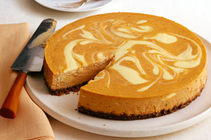 SPOON half the pumpkin batter into crust; top with spoonfuls of half the plain batter. Repeat layers; swirl with knife.