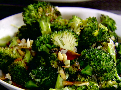 Remove the broccoli from the oven and immediately toss with 1 1/2 tablespoons olive oil, the lemon zest, lemon juice, pine nuts, Parmesan, and basil. Serve hot.