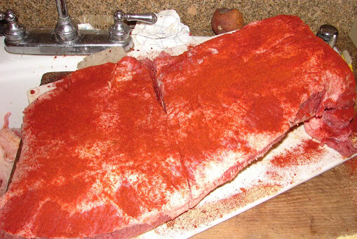 TRIM BRISKET OF EXCESSIVE FAT, KEEP 1/4 INCH ON,