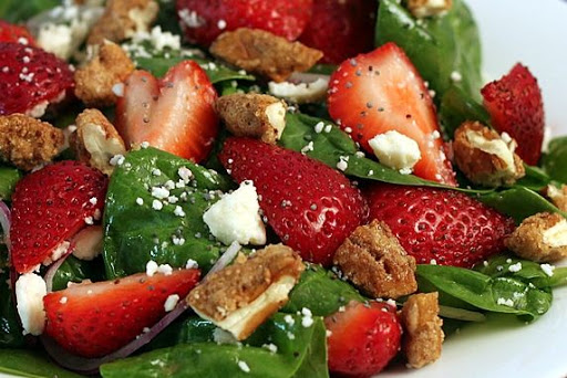 In large bowl, toss spinach, strawberries, onion, and cheese with dressing. Sprinkle candy pecan pieces on top just before serving (so they remain crisp).