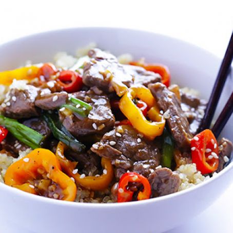 Add all marinade ingredients to a large bowl or ziplock bag, and stir to combine. Add the sliced steak, and toss in the marinade. Cover/seal and refrigerate for at least 15 minutes.