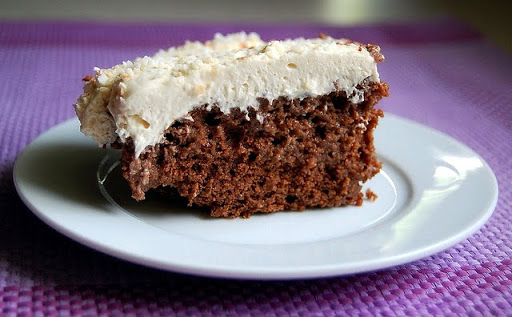 To make the whipped cream, in a large mixing bowl, using a mixer on high speed, beat together 1 3/4 cups heavy cream, vanilla and cinnamon until stiff peaks form. Beat in caramel syrup until well combined. Spread caramel whipped cream on top of cake. Process coconut in a food processor until finely ground; sprinkle coconut crumbs on top of whipped cream.