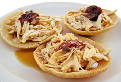 Se rellenan con la salsa al gusto, se les añade la carne o el pollo desmenuzado, la crema, una tirita de chipotle y una tirita de aguacate.