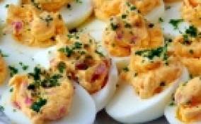 If you're looking for a deviled egg with a kick, try this recipe for a chipotle-infused deviled egg. This recipe not only will give your taste buds a jump, but it also combines everyone's favorite staples: ham and cheese. How can you go wrong with a party in your mouth?Recipe yields 2 dozen.