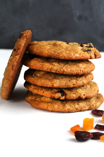 In a large bowl, place the flour blend, xanthan gum, oat flour, baking soda and salt, and whisk to combine well. Add the oats, granulated sugar and brown sugar, and whisk to combine again, working to break up any lumps in the brown sugar. Create a well in the center of the dry ingredients and add the shortening, butter, eggs, vanilla, honey and molasses, mixing to combine after each addition. The dough will be thick and you may have to knead it with your hands to get it to all come together. If it doesn’t come together, the ingredients specified to be at room temperature were likely not at room temperature. Toss the cranberries and apricots in the cornstarch, and add them to the dough. Mix until the dried fruit is evenly distributed throughout the dough.