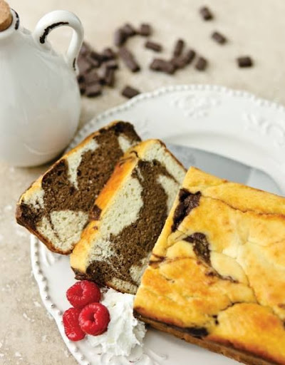5. Pour both the regular and chocolate batters into the prepared loaf pan and use a butter knife to (very) gently swirl the two together, creating a marbling effect.