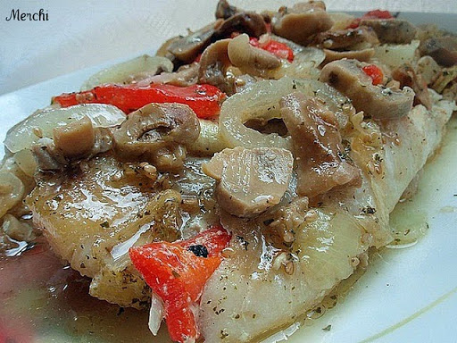 MERO AL HORNO CON CHAMPIÑONES Y PIMIENTOS