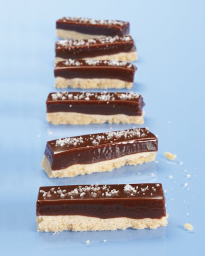 4. Pour mixture over crust. Refrigerate at least 4 hours, or overnight. Run a knife around edges; lift parchment to remove whole bar from pan. Sprinkle with sea salt. Trim edges, and cut into 16 bars.