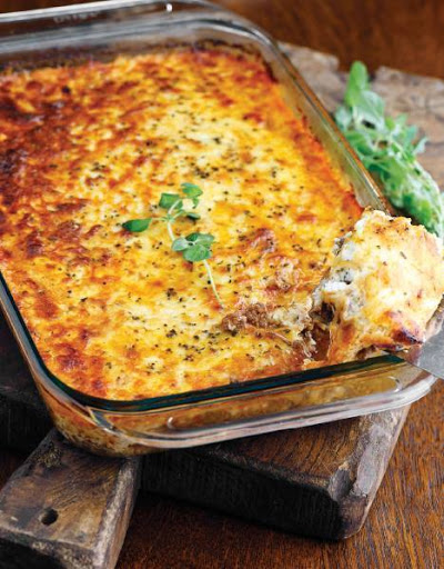 5 Fill the bottom of a 13x9 baking dish with the meat filling and top with the cheese filling.