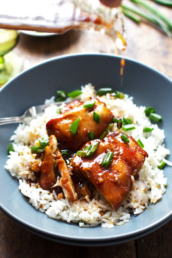 When the chicken is done, turn the oven temperature to broil and bake for an additional 5-10 minutes to get a nice, browned exterior on the chicken. Remove and serve whole or cut, with extra sauce and scallions, over the rice.