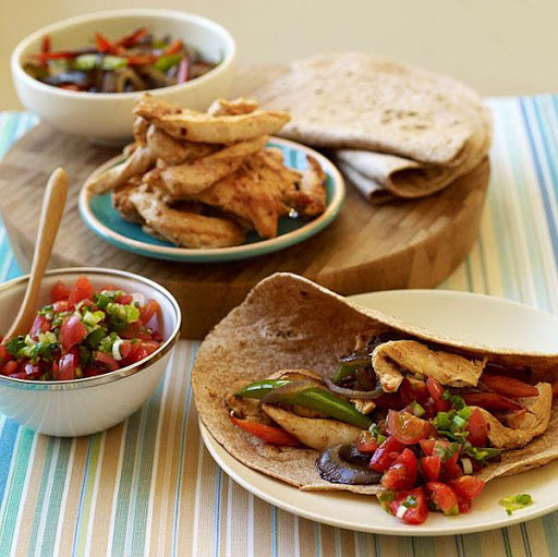 To serve, place 3 ounces of chicken strips on each tortilla; top with about 1/2 cup of vegetables and 1/2 cup of salsa.