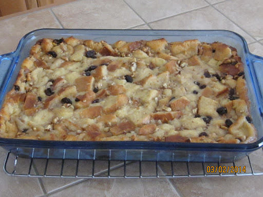 Put bread in lg. bowl. Add milk mixture. Stir in walnuts. Spoon in raisins with a small of rum in each spoonful. Mix well.