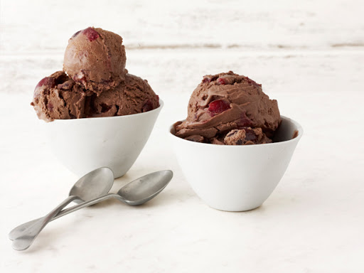 Sweet cherries add a fruity extra to creamy homemade chocolate ice cream. Cherry syrup is lightly swirled into the mixture for cherry flavor in every spoonful.