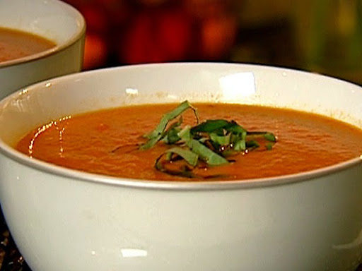 Meanwhile, in a saucepan, heat remaining olive oil over medium-low heat. Add the celery, carrot, onion and garlic, cook until softened, about 10 minutes. Add the roasted chopped canned tomatoes, reserved tomato juices, chicken broth, bay leaf and butter. Simmer until vegetables are very tender, about 15 to 20 minutes. Add basil and cream, if using. Puree with a hand held immersion blender until smooth.