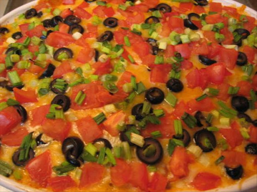 1 Set oven to 400 degrees. 2 Grease an 11 x 7-inch casserole dish. 3 In a large skillet cook the ground beef with the green chiles, onions, garlic, bell pepper, dried chili flakes (if using) and chili powder; cook over medium heat until beef is no longer pink; drain fat completely (you can prepare this mixture up to a day in advance and refrigerate). 4 Season with seasoned salt and black pepper to taste then transfer to a large bowl. 5 Stir in the tortilla pieces with cream of mushroom soup, black olives, enchilada sauce, sour cream and 1-1/2 cups shredded cheese; mix to combine. 6 Transfer to prepared baking dish. 7 Cover and bake for about 30 minutes. 8 Uncover and sprinkle with about 2 cups (or more of shredded cheese then chopped tomatoes. 9 Return to oven and bake uncovered until casserole is bubbly and the cheese has melted (about 8-10 minutes). 10 Serve with toppings.