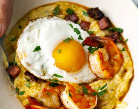 •Divide grits among bowls, forming a well in center. Spoon shrimp mixture into center of grits. Top with egg. Sprinkle tarragon over.