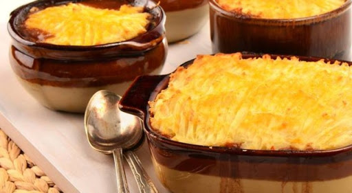 Top with mashed potatoes and bake at 350 for 30 minutes or until the potatoes are lightly browned.
