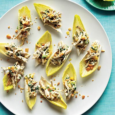 3. Spoon chicken salad onto endive spears, then sprinkle with macadamia nuts.