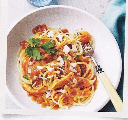 Sauté Spanish onions and next four ingredients in hot bacon drippings in a large Dutch oven over medium-high heat 8 to 10 minutes. Stir in tomato sauce and next six ingredients. And one cup water and chicken. Bring to a boil; reduce heat to medium low and simmer covered for one hour. Remove chicken reserving tomato mixture and Dutch oven. Cool chicken for 20 minutes. Simmer reserved tomato mixture for 20 minutes. Shred chicken and stir into tomato mixture. Stir in parsley. . Salt and pepper to taste. Serve over spaghetti.