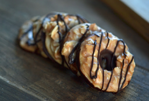 Assemble the Cookies. Dip one side of each cooled cookie lightly in the melted caramel mixture, and place, caramel-dipped side up, on a piece of parchment paper. Add the toasted and crushed coconut chips to the rest of the melted caramel mixture and mix to combine. With a butter knife or small offset spatula, spread the coconut-caramel mixture on top of the caramel layer on each cookie in a single layer a bit more than 1/8 inch thick. Place the assembled cookies in the refrigerator until they are set (about 10 minutes). While the cookies chill, make the chocolate coating.