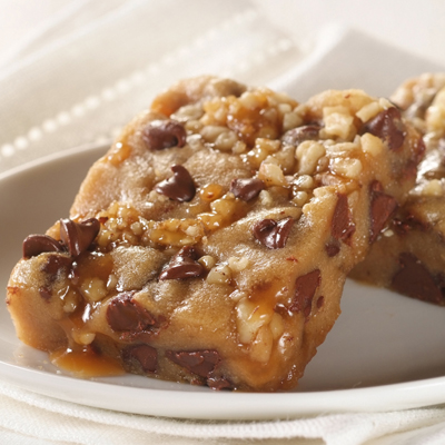 SPRINKLE1/4 cup nuts over cookie crust; drizzle caramel syrup over nuts. Top with teaspoonfuls of remaining cookie dough; press gently into caramel syrup. Sprinkle with remaining 1/4 cup nuts.