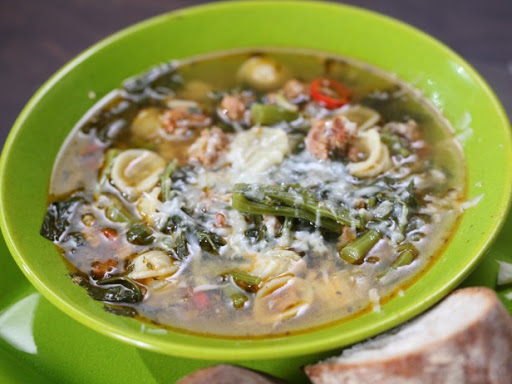 Heat a Dutch oven or large soup pot over medium-high heat with extra-virgin olive oil, a turn of the pan. Add the sausage and brown and crumble, 7 to 8 minutes. Add the onions, garlic and chile and cook a few minutes more. Add the thyme and lemon zest, then add broccoli rabe and season with a little nutmeg. Stir in the stock and the water and bring to a boil. Simmer a few minutes to combine the flavors. Turn off the heat, cool and store for a make-ahead meal. Reheat the stoup over low heat and bring to a low boil. Add the pasta and cook to al dente, about 10 minutes. Ladle the stoup in shallow bowls and garnish with cheese. Serve with crusty bread for mopping.