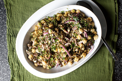 *Add* the onion slices and break them up with your fingers. *Add* the lentils and the chickpeas and the preserved lemon and mix well. *Stir in* the herbs, then crumble in the cheese and gently toss again. *Taste* and adjust seasoning if required.