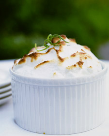 2. Stir 1/4 cup of the superfine sugar with the lime juice in a small bowl until the sugar is dissolved. Set aside. Using very clean, dry beaters, beat the egg whites by hand or with an electric mixer until foamy. Gradually add the remaining 1/4 cup of superfine sugar and the salt while beating. Continue beating until the whites hold a soft peak. Gently fold in the lime juice mixture and the zest.