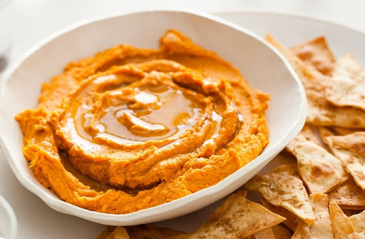 3. Place ingredients for hummus into a food processor and blend until smooth. Adjust seasonings and stir. Top with a small drizzle of olive oil and a sprinkle of cumin. Serve with baked flatbread chips.