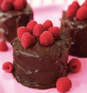 Heat oven to 350°. Coat bottom of a 9" x 13" baking pan with cooking spray. In a bowl, beat egg whites, 1 tbsp water, cream of tartar and salt until foamy. Continue to beat, adding sugar gradually, until batter is fluffy. Add vanilla; beat 1 minute. Add a small amount of flour and fold in; repeat until you've incorporated all of the flour. Spread batter evenly in pan. Bake until cake is light golden and surface springs back when touched gently, 25 to 30 minutes. Run a knife around edges of cake; let cool on a rack 2 hours. In a small pan over medium heat, bring preserves to a gentle simmer, stirring. In a microwave-safe bowl, nuke chocolate until melted; stir in sour cream. Invert cake onto a cutting board. With a 2 1/2-inch round cookie cutter, cut 12 rounds from cake. Top a round with 1 heaping tbsp preserves; cover with a second round; repeat with remaining rounds and preserves. Spread each cake with 1/4 cup frosting, coating top and sides. Garnish with raspberries.