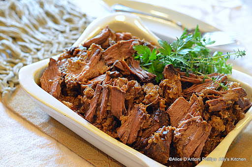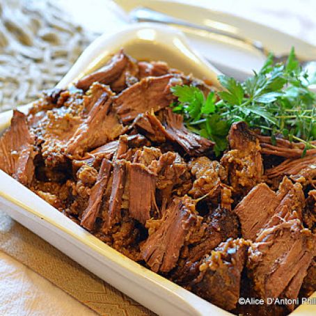 Put meat in the hot oil and sear on all sides. Reduce heat and slowly add in the marinade plus another 1 1/2 cups of water. Cover tightly with a lid and put in a preheated 400 oven for one hour. Reduce heat to 300. Check to see if you need to add a little more water (or beef broth). Cook another about 2 hours. Remove and meat should tear apart with a fork. There will be a thick gravy. Thin with more water or beef broth.