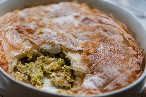 9. Tuck the edges of the top sheets of filo as best you can under basteeya, trimming the edges if it makes it easier. (You can also just fold them over the top, and press them down.) Brush the top liberally with butter and bake the basteeya for 30 to 40 minutes, or until the top is well-browned.