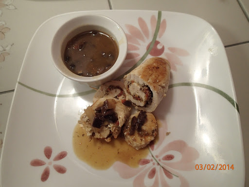 Stuffed chicken breasts with kalamata olives and a white wine reduction.