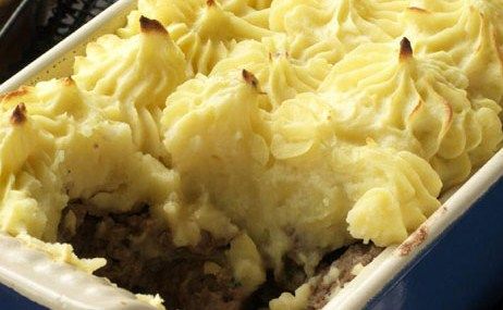 5. Spoon the mashed cauliflower over top of the ground beef in the casserole dish, spreading to cover evenly. Bake for about 20 minutes, until the top starts to brown. Remove and let sit a few minutes before serving hot.