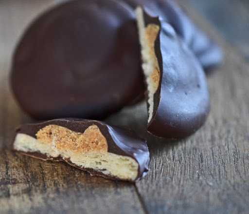 Melt the Chocolate & Complete the Cookies. Melt the chocolate and shortening in a double boiler or a small, microwave safe bowl, on 70% power at 30-second intervals, stirring in between, just until melted and smooth. Remove the chilled cookies from the freezer, and carefully immerse each cookie in the melted chocolate. With a dipping fork (or any fork, really), carefully turn the cookie over in the chocolate until it is completely coated. Turn the cookie right side up in the chocolate and draw the cookie  out of the chocolate on the tines of the fork, scraping the bottom of the fork on the side of the bowl to rid the bottom of excess chocolate. Place the cookie back on the parchment paper. Allow to sit at room temperature until the chocolate is set. Store in an airtight container in the refrigerator until ready to serve. Freeze any leftovers.