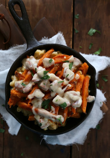 To serve: pour mac and cheese into a skillet, top with poutine, and drizzle andouille gravy over top. Garnish with parsley.