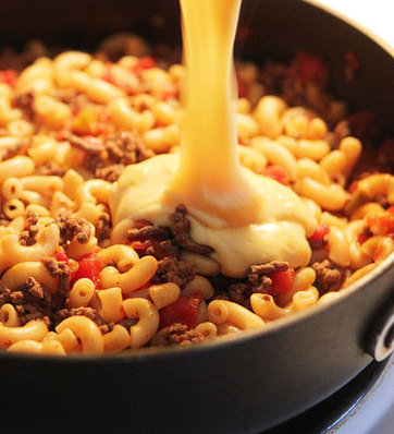 Melt the butter in a saucepan. Whisk in the flour and cook, whisking for 5 minutes until fragrant and light brown in color. Whisk in the milk and bring to a boil. Whisk until smooth and thickened. Remove from heat and stir in the shredded cheddar cheese until melted. Add the salt and pepper to the cheese sauce. Pour the cheese sauce over the hamburger mixture. Stir gently to combine.